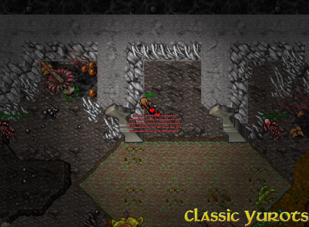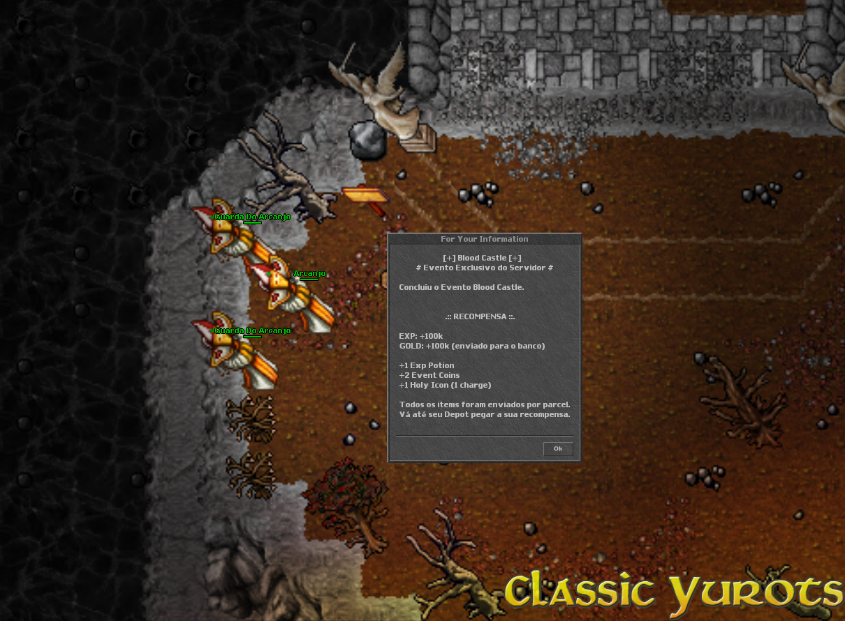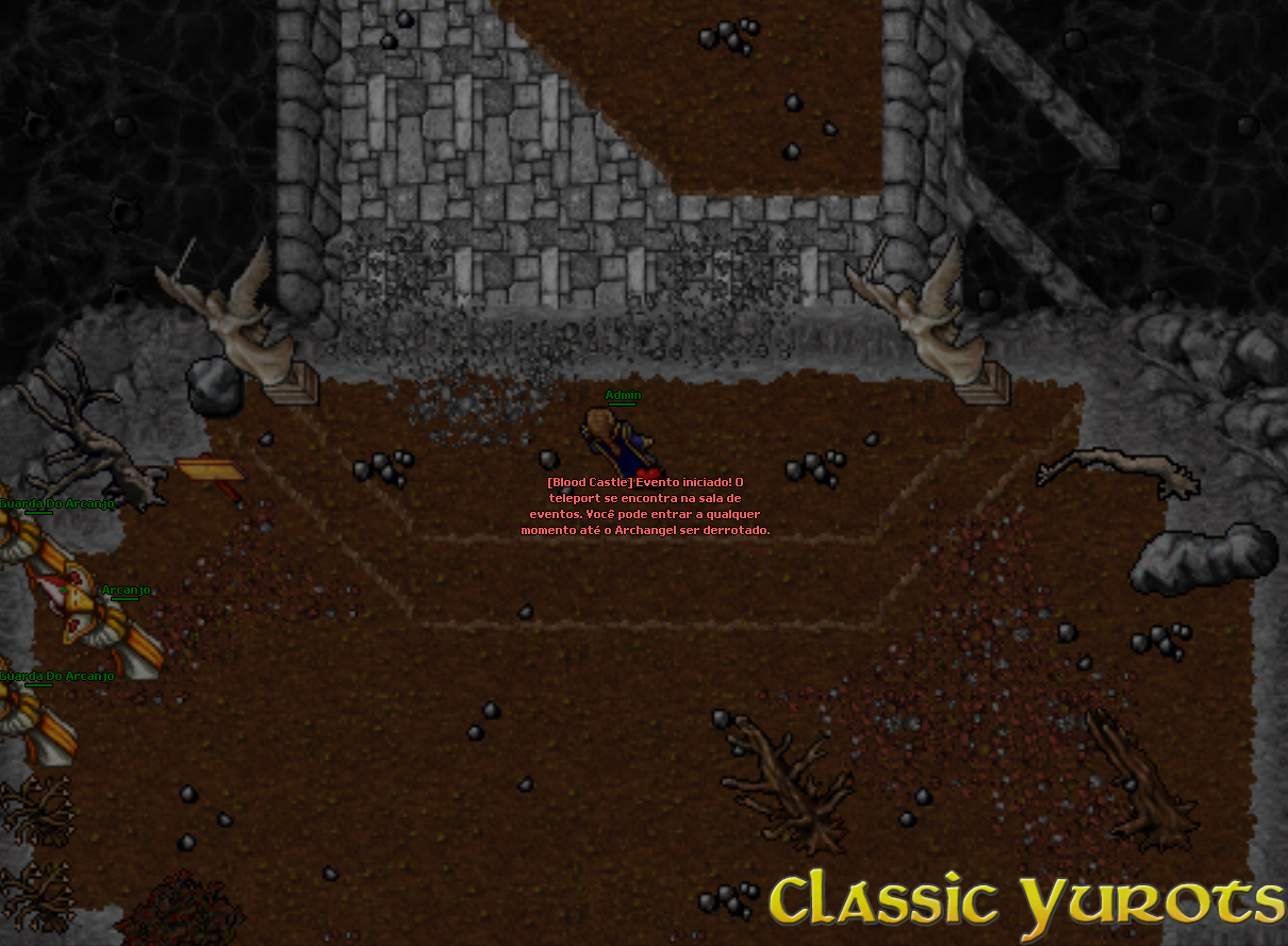 Quando o evento inicia uma mensagem é envianda no broadcast e um teleport aparece na sala de eventos. Em alguns minutos o evento será iniciado e as pedras serão removidas. Não é necessário falar com o NPC neste momento. Após as pedras serem removidas, haverá vários monstros ao caminho. No final, haverá uma alavanca. Para poder usar a alavanca é necessário elimitar todos os monstros da área. Quando a alavanca for acionada, você deverá destruir o portão para ter acesso ao Archangel. NOTE: Nenhuma Spell poderá ser utilizada para atacar o portão, apenas danos básicos. Após destruir o portão, o Archangel aparecerá e todos que estão no evento devem derrotá-lo. Assim que o Archangel for derrotado, todos os jogadores que deram ao menos 1 HIT devem falar com o NPC no ínicio do evento para pegar a recompensa. NOTE: A recompensa é enviada por parcel. |