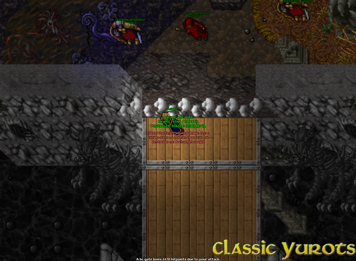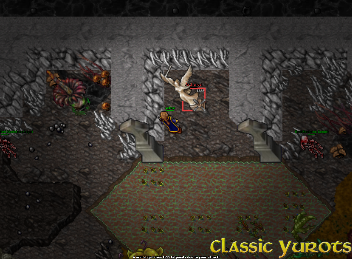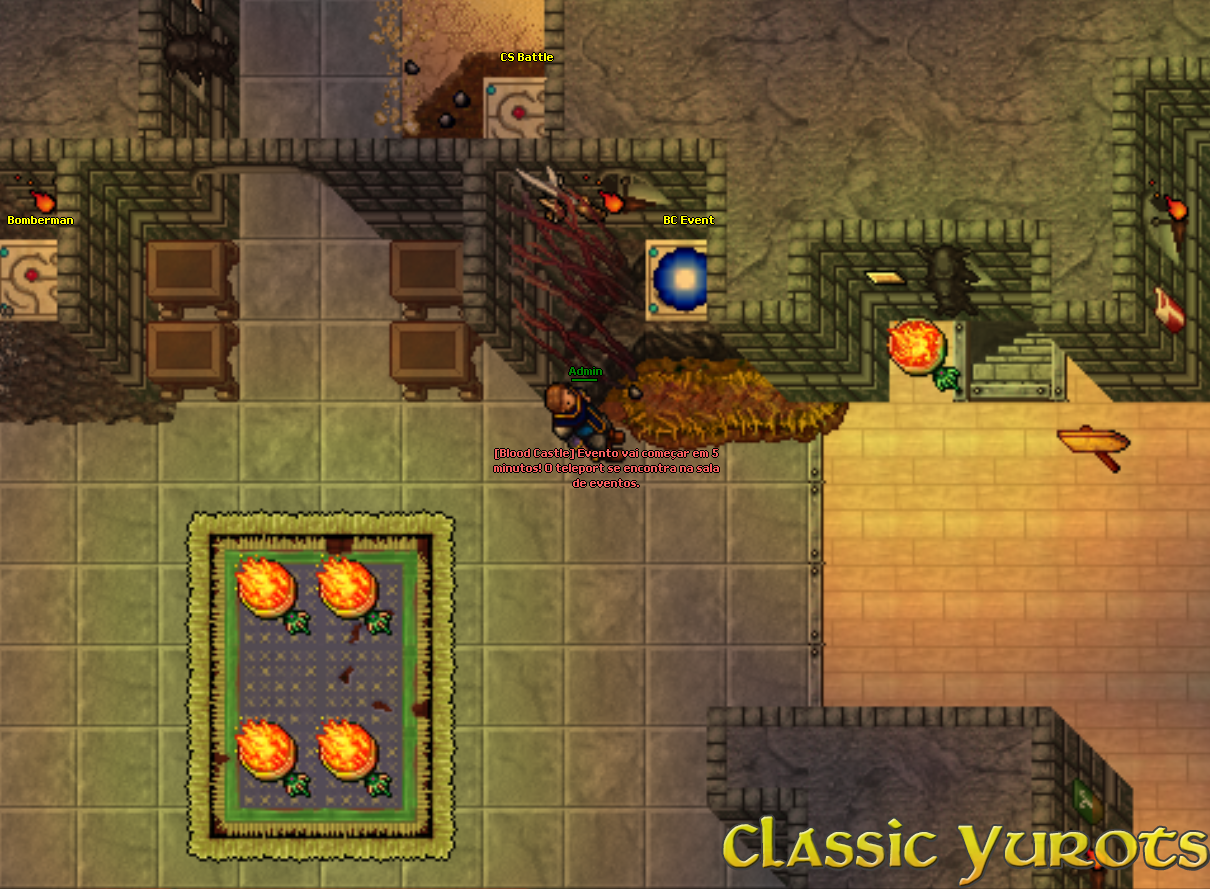 Quando o evento inicia uma mensagem é envianda no broadcast e um teleport aparece na sala de eventos. Em alguns minutos o evento será iniciado e as pedras serão removidas. Não é necessário falar com o NPC neste momento. Após as pedras serem removidas, haverá vários monstros ao caminho. No final, haverá uma alavanca. Para poder usar a alavanca é necessário elimitar todos os monstros da área. Quando a alavanca for acionada, você deverá destruir o portão para ter acesso ao Archangel. NOTE: Nenhuma Spell poderá ser utilizada para atacar o portão, apenas danos básicos. Após destruir o portão, o Archangel aparecerá e todos que estão no evento devem derrotá-lo. Assim que o Archangel for derrotado, todos os jogadores que deram ao menos 1 HIT devem falar com o NPC no ínicio do evento para pegar a recompensa. NOTE: A recompensa é enviada por parcel. |